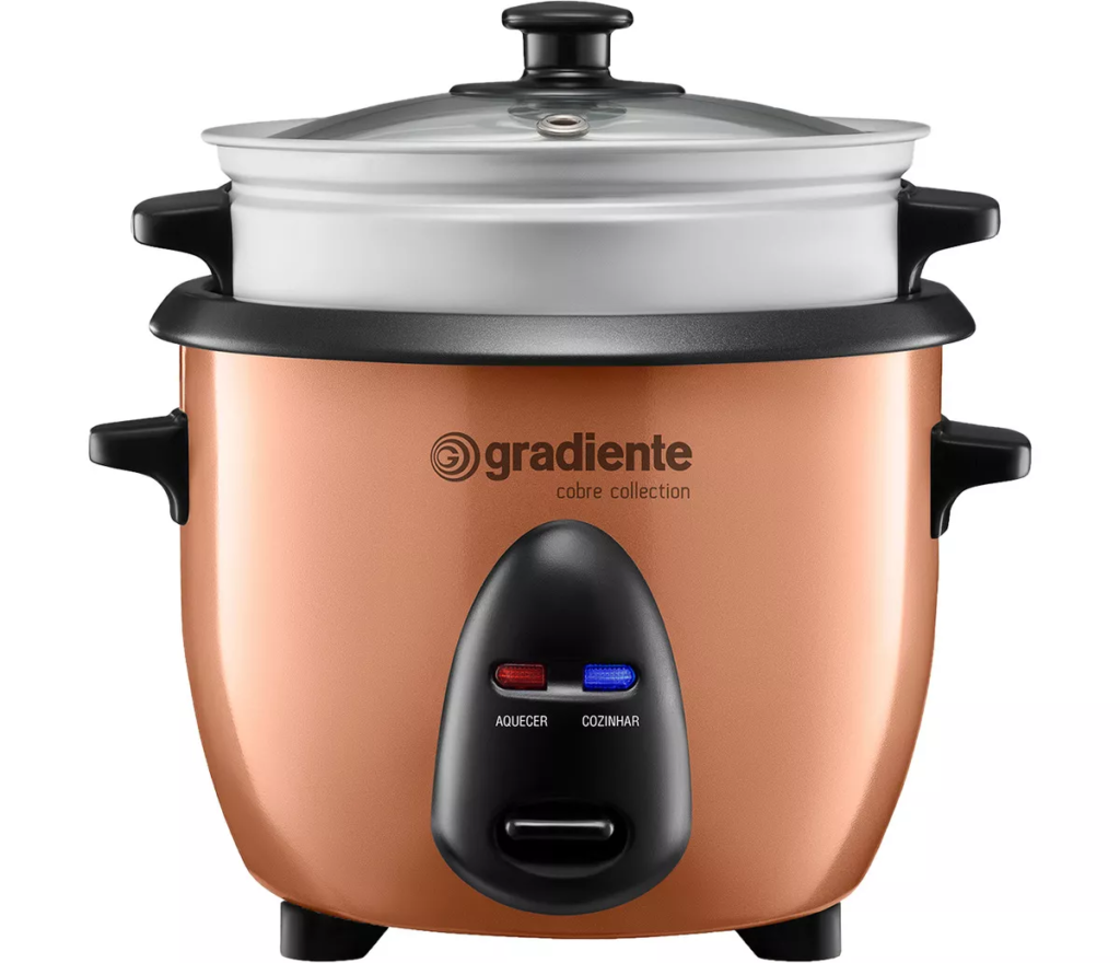 A panela tem o design elegante, contando com aço inoxidável escovado pintado na cor cobre. Outro predicado é ter a segurança garantida, já que conta com desligamento automático quando o equipamento superaquece.